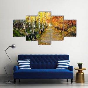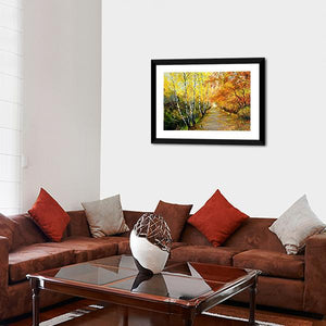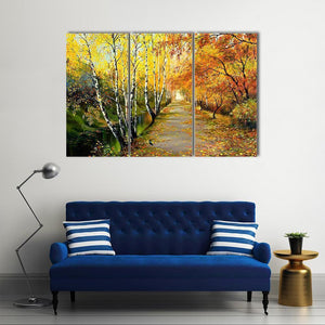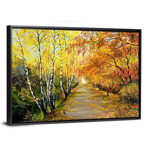 An impressionistic autumn path lined with birch trees and fall foliage, with fallen leaves on the trail, a small bird on the path, and a stream running to the left. Rendered in warm yellows, oranges, browns and touches of green, the scene feels peaceful and quietly autumnal. Suits modern and nature-inspired interiors as a calm piece of room decor.