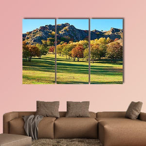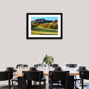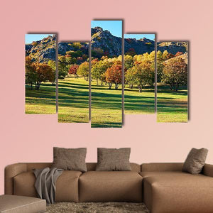 Trees, a wide steppe field and a rocky mountain peak sit beneath a low setting sun, with fall foliage and long shadows that give the scene a clear sense of depth. The warm greens, yellows and oranges create a peaceful, rustic, autumnal mood that works well with rustic or modern home room decor.