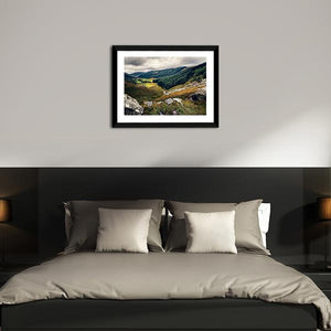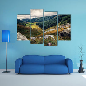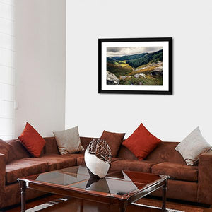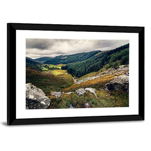 Glenmacnass Waterfall Canvas shows a rocky foreground and grassy valley framed by a dense evergreen forest beneath a cloudy sky. The nature-photography scene reads calm and rugged, with green, brown, gray and blue tones that pair well with nature-inspired or neutral décor.