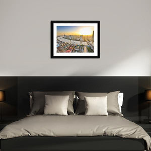 Bangkok At Twilight captures a high-angle cityscape of a river, suspension bridge, and modern buildings. A palette of soft yellow, blue, brown and white creates a serene, expansive twilight mood that fits modern or travel-themed rooms.