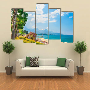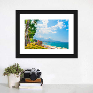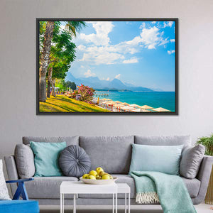 Beach With Green Trees In Kemer is a vibrant, photorealistic canvas showing a daytime beach scene with blue ocean, green trees, sandy shore and white clouds. The composition follows the rule of thirds and includes palm trees, a pier, umbrellas and flower accents. Its serene, vacation-ready mood suits modern coastal or beach-themed rooms.