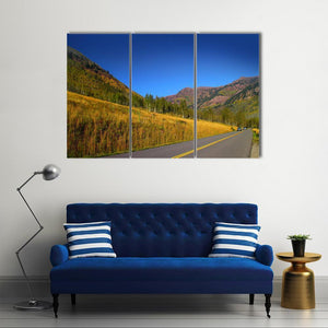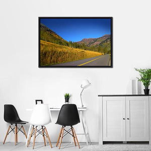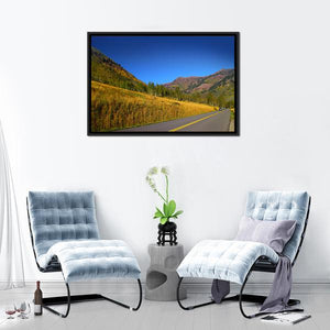 This landscape canvas captures a serene mountain road framed by vibrant autumn foliage and tall grass. Its calming palette of yellows, greens, and browns brings a scenic, rustic touch to your decor.