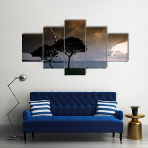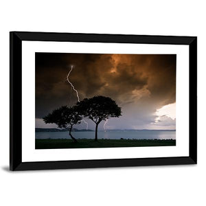 This striking artwork features two silhouetted trees under a dramatic storm sky, illuminated by a bright lightning bolt. Its intense colors of dark orange, grey, and black create an awe-inspiring atmosphere, making it a standout piece for nature lovers.