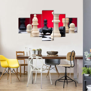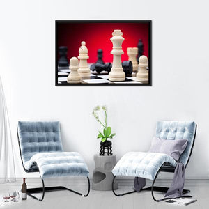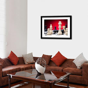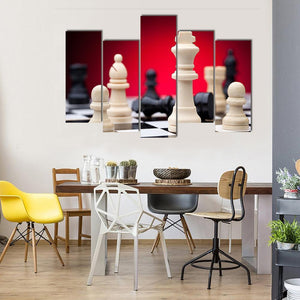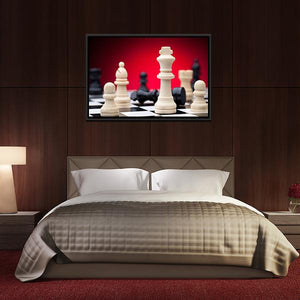 This canvas wall art features a dramatic close-up of chess pieces, including kings, pawns, and bishops, set against a striking red gradient backdrop. The intense and strategic atmosphere makes it an engaging addition to your decor.