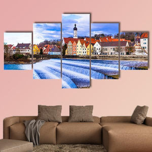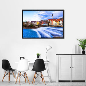 A photorealistic landscape of Landsberg am Lech showing the river, a stepped waterfall and colorful village buildings with a church steeple under a clear daytime sky. The scene uses rule-of-thirds composition with depth and natural framing, and a palette of blues, yellows, oranges, whites and greens for a vibrant, peaceful look. Suited to modern room decor.