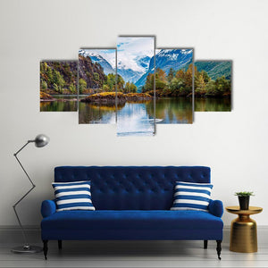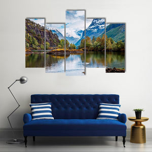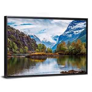 This canvas art features a serene mountain lake scene framed by snow-capped mountains, trees, and rocks. With reflective pools and hints of autumn foliage, it invites a calm atmosphere, making it a beautiful addition to any space.