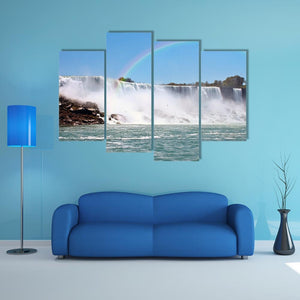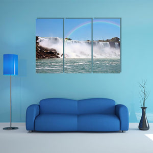 This photorealistic canvas shows a rainbow arching over Niagara Falls, with mist rising from the falls, rocks at the base, and trees on the horizon. The scene feels serene, majestic, and vibrant in blues, whites, greens, and browns, suited to modern living rooms or nature-themed spaces.