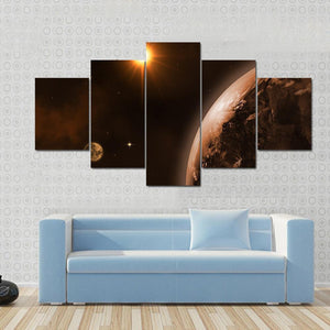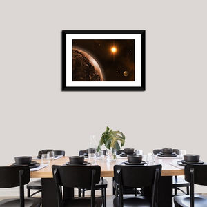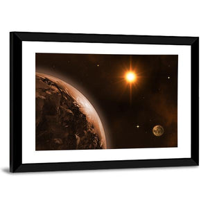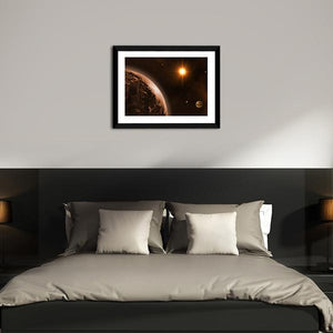 This captivating piece features the moon, earth, and stars in a cosmic scene, evoking a sense of wonder. The rich palette of browns, oranges, and blacks enhances its mysterious vibe, perfect for creating a serene atmosphere in any space.
