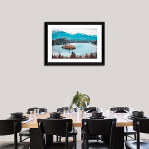 Depicting Bled Castle on its lake island with a church and snow-capped mountains, this canvas captures a serene, majestic autumn scene. The realistic, naturalistic palette of blues, turquoises, greens, browns, and grays and a rule-of-thirds composition make it a calm focal point for modern or nature-themed room decor.