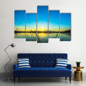Blue Sky At Calm Lake depicts a tranquil lakeside at sunset with the sun lowering over calm water and reeds in the foreground. The modern landscape uses blues, greens, yellows and soft orange to create a serene, peaceful feeling. It makes a calm, modern wall decor choice for living spaces.