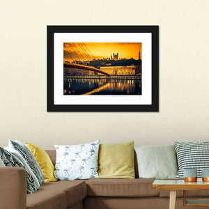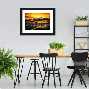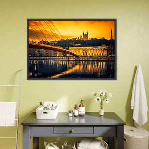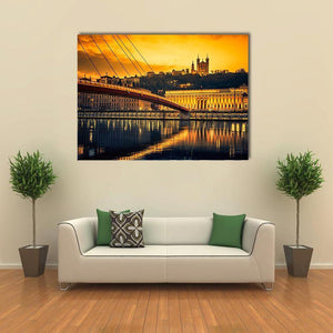 Bridge Over Saone River Canvas presents a suspension bridge, historic buildings, and water reflections bathed in golden-hour light. The modern cityscape balances dramatic and serene tones with vibrant orange, yellow, blue and black, suited to contemporary living rooms or entryways.