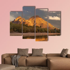 Canal With Mountain Canvas Wall Art depicts a calm canal beside rocky mountain peaks, with trees along the river bank, clouds overhead, and clear water reflections. Warm golden-brown and blue tones give a serene, golden-hour feel that suits modern living rooms and bedrooms.