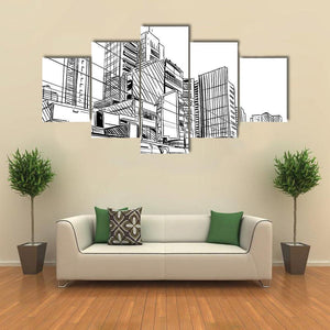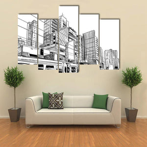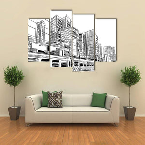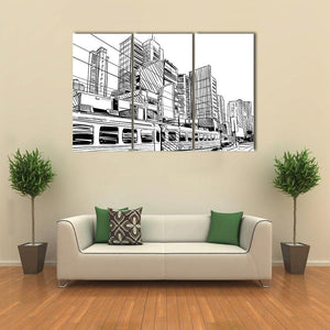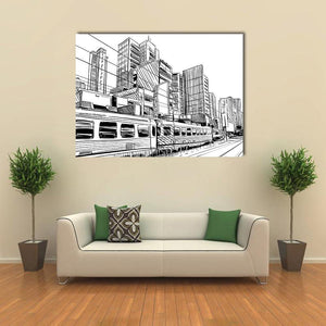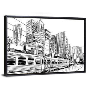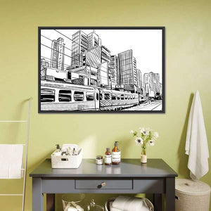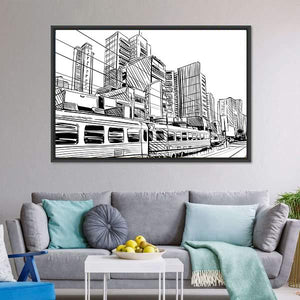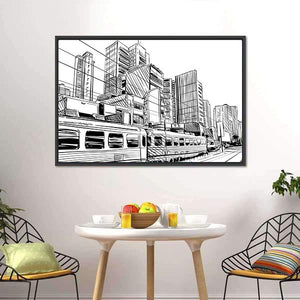 This canvas displays a dynamic city skyline with a detailed train, capturing the vibrant energy of urban life. The sketchy, modern style in black and white adds a graphic touch to your wall.
