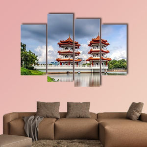 Twin Pagoda China Canvas shows two red-tiled pagodas beside a tranquil lake, with a bridge, trees and a cloudy daytime sky reflected in the water. The realistic, symmetrical composition feels serene and majestic, with blues, greens, red and soft greys creating a peaceful atmosphere. It works well as wall decor in a living room or entryway and pairs with modern or Asian-inspired interiors.