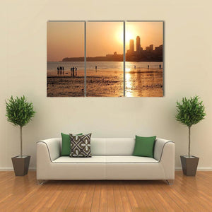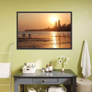 Capture the tranquil beauty of Chowpatty Beach with this canvas wall art. Featuring silhouettes of people and buildings against a stunning sunset palette of orange and yellow, this piece brings a warm and serene atmosphere to any space.
