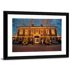 Christmas In Gothenburg Canvas Wall Art captures a symmetrical night scene in Gothenburg with a building and trees lit by Christmas lights. Warm brown, golden, blue and green tones create a cozy, festive, inviting atmosphere. The print suits modern or Scandinavian-inspired rooms as seasonal wall decor.