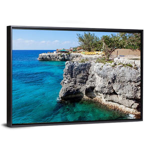 This canvas features stunning coastal cliffs set against a vibrant tropical ocean. The serene palette of blue, green, and white creates a calming atmosphere, perfect for enhancing any modern living space.