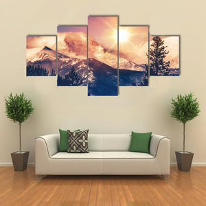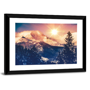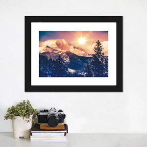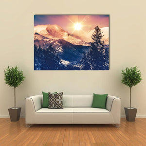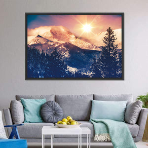 This canvas art beautifully captures the serene and majestic snowy mountains of Colorado, bathed in a warm sunrise glow. The vibrant palette of blue, pink, and orange creates a bright atmosphere, perfect for enhancing your room's decor.