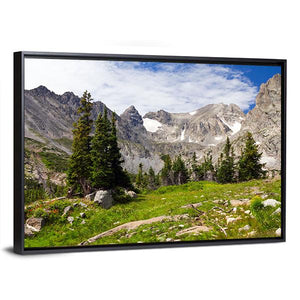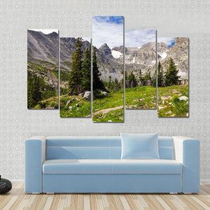 This canvas showcases a majestic mountain range framed by pine trees and an alpine meadow. The serene palette of green, gray, and blue captures the rugged beauty of summer, making it a stunning focal point for any nature lover's decor.