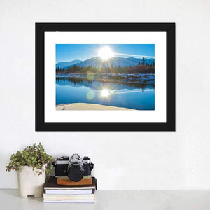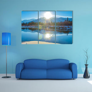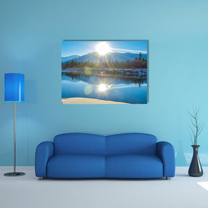 Columbia River In Canada Canvas Wall Art depicts the Columbia River with sun, snow-dusted mountains, trees and a reflective lake in a realistic landscape. The sunburst reflection and a cool blue, white and green palette create a serene, bright, majestic mood that suits modern living rooms or nature-themed spaces.