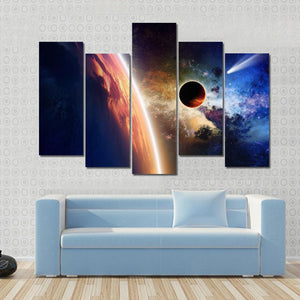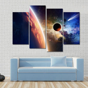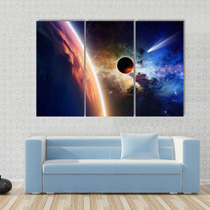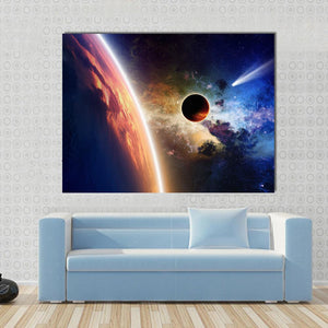 This captivating canvas art features a luminous planet and a streaking comet, evoking a cosmic atmosphere. The rich blues, oranges, and purples create a dramatic vibe that enhances any space.