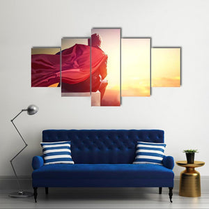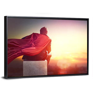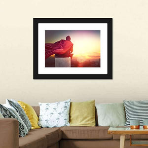 A man in a flowing cape looks over a cityscape at sunset, rendered in reds, yellows, oranges and purple with a rule-of-thirds composition. The dramatic, cinematic scene feels contemplative, powerful and hopeful and fits well in modern living rooms or a home office.