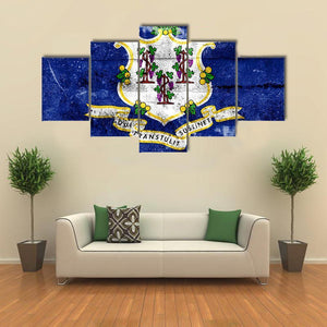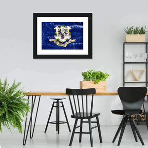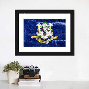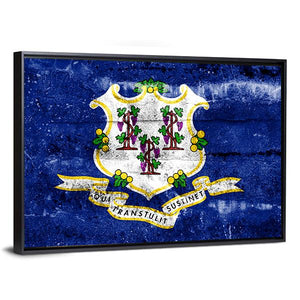 This canvas depicts the Connecticut state flag and coat of arms, including the grunge-textured banner that reads "QUI TRANSTULIT SUSTINET." The vintage, textured finish and historic, patriotic mood make it a calm, characterful piece for home wall decor and modern interiors.