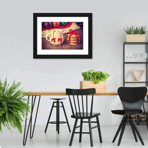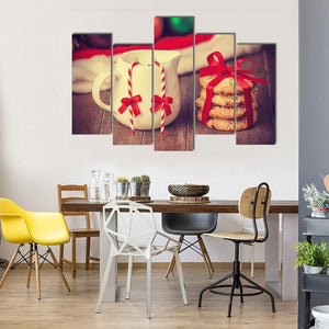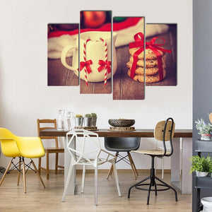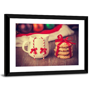This whimsical canvas art features a charming arrangement of cookies and candy canes alongside a white jug, evoking a cozy, festive atmosphere. The warm colors of red, brown, and gold make it a delightful addition to any holiday décor.