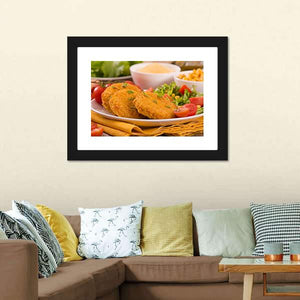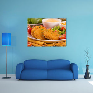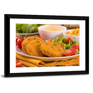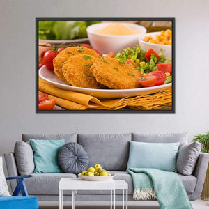 Corn Burgers Canvas Wall Art features a close-up, realistic view of breaded chicken patties with cherry tomatoes, lettuce and a bowl of corn. The appetizing, fresh and hearty image pairs well with kitchen or dining room décor and modern casual spaces.