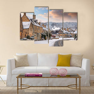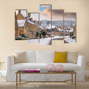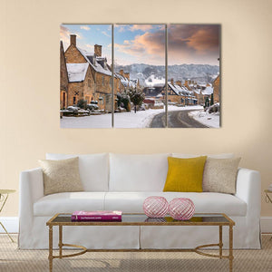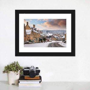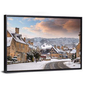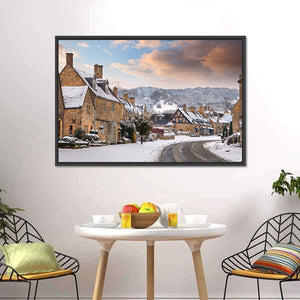 This canvas art captures a serene, snowy village street, featuring cozy cottage houses under a partly cloudy sky. With its peaceful mood and realistic details, it's an inviting addition to any winter-themed decor.