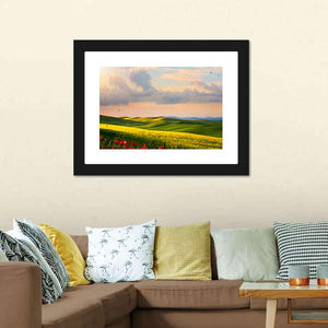 This realistic canvas shows an Italian countryside of rolling hills, wheat fields, poppies and a flock of birds under a warm late-afternoon sky. Sunlight illuminates the wheat and gives the scene a peaceful, serene, and gently vibrant feeling. Suits country and modern interiors seeking nature-focused wall decor.
