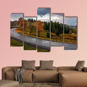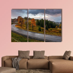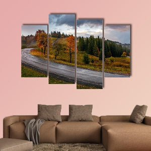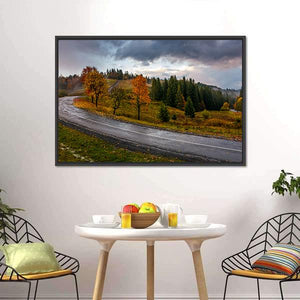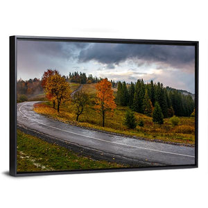 This canvas shows a winding road through a forested mountainside, framed by autumn foliage and coniferous trees under low gray clouds. The scene feels moody and serene, with green, brown, orange, gray and blue tones. It suits rustic or nature-inspired rooms that welcome a quiet, contemplative view.