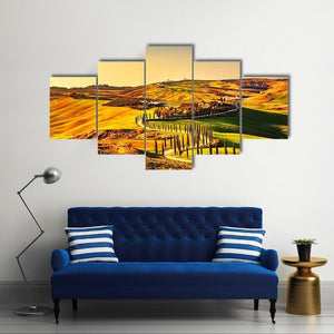 This canvas art captures a winding road flanked by graceful cypress trees, leading through sunlit golden hills. The serene landscape evokes an idyllic, pastoral mood, perfect for adding a touch of rustic charm to your decor.