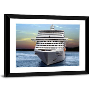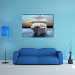 A photorealistic front-view of a cruise ship gliding across calm ocean waters at sunset. Cool blues and whites with soft orange and grey tones create a serene, tranquil atmosphere. Suited to modern living rooms or bedrooms as understated room decor.