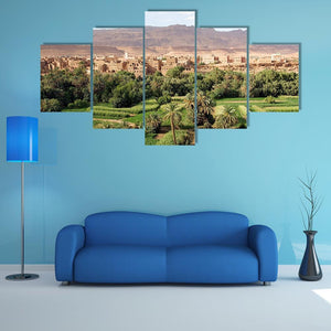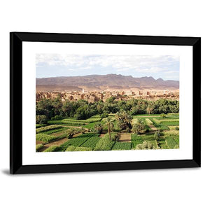 This Moroccan landscape artwork captures serene farming terraces and a charming village nestled among palm trees and mountains. Its rustic style and lush green palette make it a lovely addition to your wall decor.