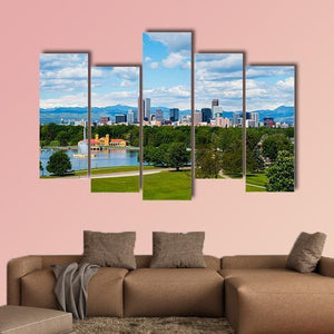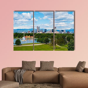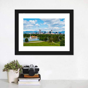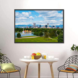 Denver Downtown, Colorado — a wide-angle, realistic canvas depicting a peaceful city skyline beside a lake and park, with distant mountains and fluffy clouds. Blue, green, white and neutral tones create a calm, scenic daytime mood that works well in modern or nature-inspired rooms.