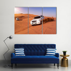 This action-packed canvas shows two white SUVs during a desert safari, one kicking up sand as they race across sunlit dunes. A realistic style, dynamic perspective and strong depth of field use an orange, blue, white and brown palette to give the scene adventurous, exhilarating energy. Works well in modern home décor and room settings that favor automotive or nature landscape art.