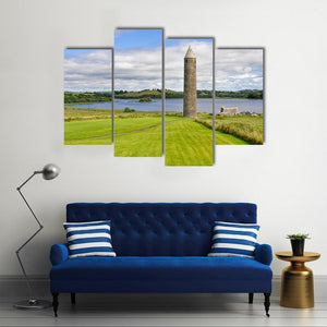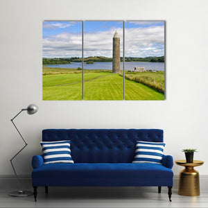 Featuring a tranquil landscape of a historic monastic site, this canvas art showcases a round tower surrounded by rolling hills and a serene body of water. Its calming green and blue palette enhances the scenic quality, making it a beautiful decorative piece for any room.