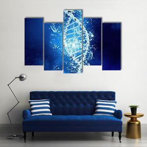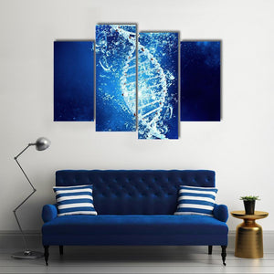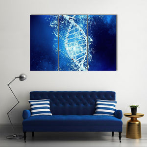 A centered, dynamic depiction of a DNA strand suspended in water splashes, featuring a glowing double-helix and scattered droplets. The blue, white, light-blue and gold palette gives a vibrant, scientific, fluid mood that fits modern homes and science-themed rooms.