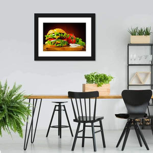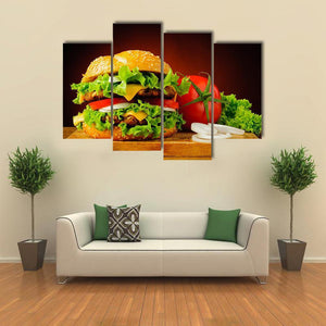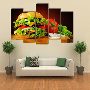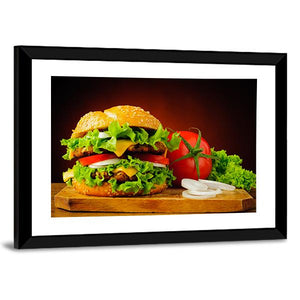 A close-up, eye-level image of a double cheeseburger featuring a sesame seed bun, double patty, sliced tomato, onion rings and crisp lettuce. The realistic food photography feels fresh, vibrant and appetizing with green, red, brown and yellow tones. Fits well in kitchens, dining rooms or casual restaurant spaces.