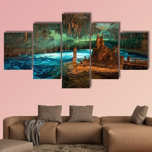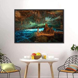 Dragon Caves Lake Canvas Wall Art shows a realistic underground cave with hanging stalactites and a glowing blue lake. The blue, brown, green and orange palette gives a mysterious, tranquil, awe‑inspiring mood that works well in modern and contemporary rooms.