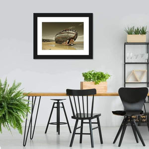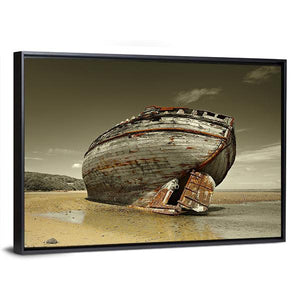 Capture the haunting beauty of a shipwreck set against a desolate beach. This artwork combines a vintage aesthetic with a melancholic mood, showcasing a partially submerged wooden hull and rusted metal elements amidst sandy tidal pools and a cloudy sky.