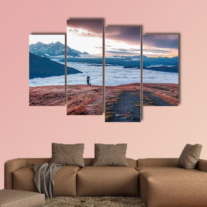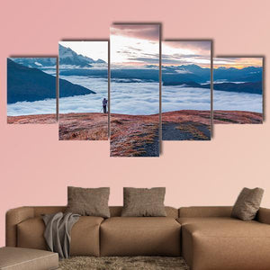 Foggy Caucasus Mountains Canvas shows a person standing on a ridge overlooking clouds, with snow-capped peaks receding beneath a dramatic sky. The palette of blue, white, orange and purple gives the scene a serene, awe-inspiring and adventurous mood. Works well in modern or nature-focused rooms as a contemplative focal piece.