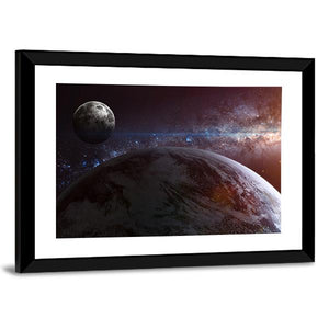 This canvas art features a breathtaking view of our planet, the moon, and distant stars. With a cosmic palette of blue, black, white, and orange, it creates an awe-inspiring atmosphere that captivates. Ideal for those seeking modern wall decor that sparks wonder.