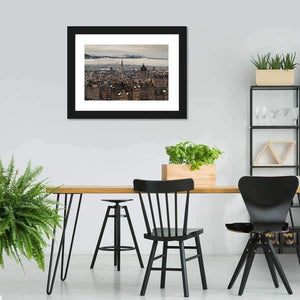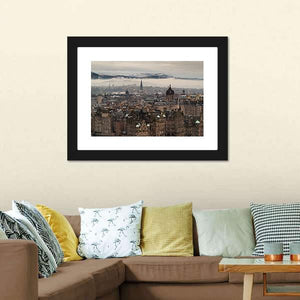 This realistic canvas presents an aerial view of Edinburgh’s skyline, showing church spires, domed buildings and a hilly backdrop. Rendered in muted brown, gray, white and blue tones, the scene feels overcast and atmospheric. It suits room decor in both modern and historic interiors.