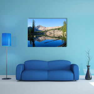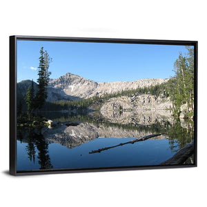 This landscape artwork captures the serene beauty of a tranquil lake surrounded by majestic mountains and trees. With its soothing color palette of blue, green, and gray, it evokes a peaceful atmosphere ideal for nature lovers.