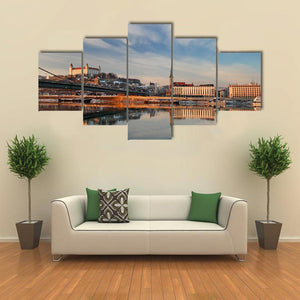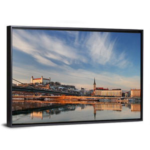 A realistic cityscape of the Danube valley showing a castle, riverside buildings and a bridge with their reflections on calm water. Wispy clouds and snow on the land lend a peaceful, historic mood in a blue, white and brown palette; it suits living rooms, hallways, or modern room decor.