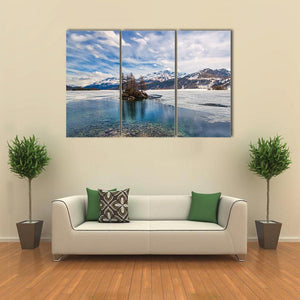 Engadine Valley, Switzerland depicts a serene winter lake scene with snow-capped mountains and a small island dotted with sparse trees. Rendered in a realistic style with a cool blue, white, green and grey palette, this canvas suits modern living rooms or nature-inspired spaces that call for a calm focal piece.