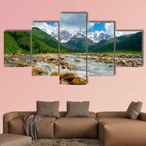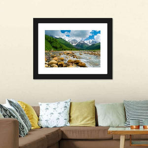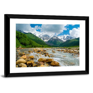 Enguri River in Georgia appears as a realistic mountain river scene with snow-capped peaks and green hills. The print highlights a rocky riverbed and puffy clouds, conveying a serene, majestic, natural mood. Suited to modern living rooms or home offices as calm nature-focused wall decor.