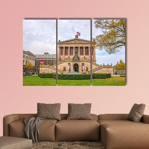 A centered, symmetrical view of the museum building with its fountain, hedges and trees, plus classical details like a statue on the facade and flags on the roof. Rendered in tan, green, blue and white, the print carries a grand, stately daytime mood that fits well in living rooms, entryways, or classical-style interiors.